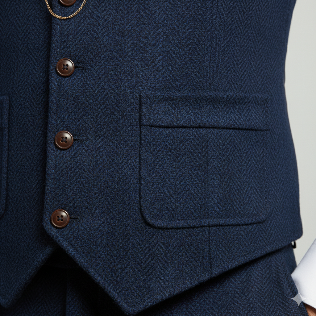Die Herren Weste mit Fischgrätenmuster kombiniert klassischen Stil mit modernem Komfort. Das feine Muster und die taillierte Passform verleihen jedem Outfit eine elegante Note – ideal für Büro, Events oder Freizeit. Jetzt entdecken und stilvoll auftreten!