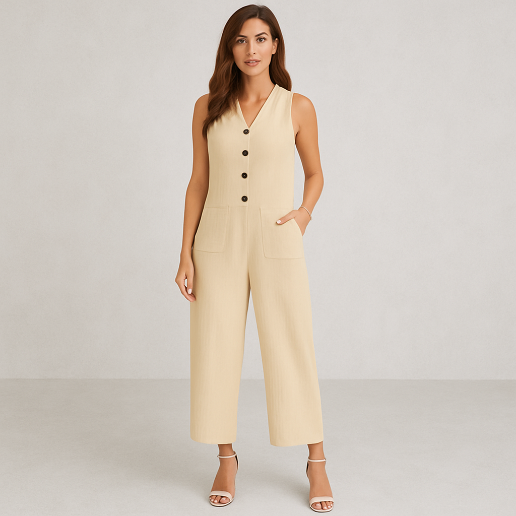 Damen Leinen Jumpsuit ärmellos | Herbst Elegant mit Knopfleiste