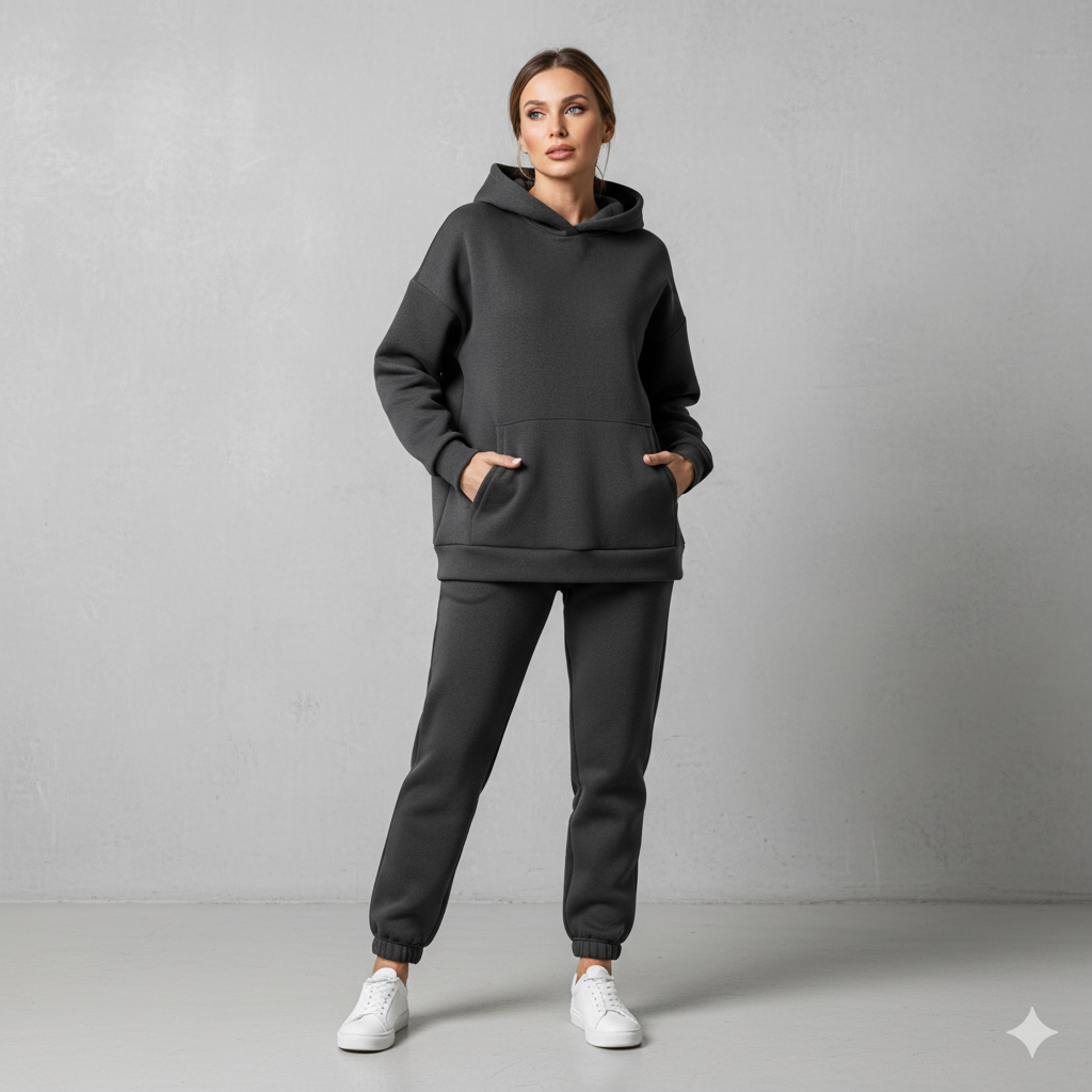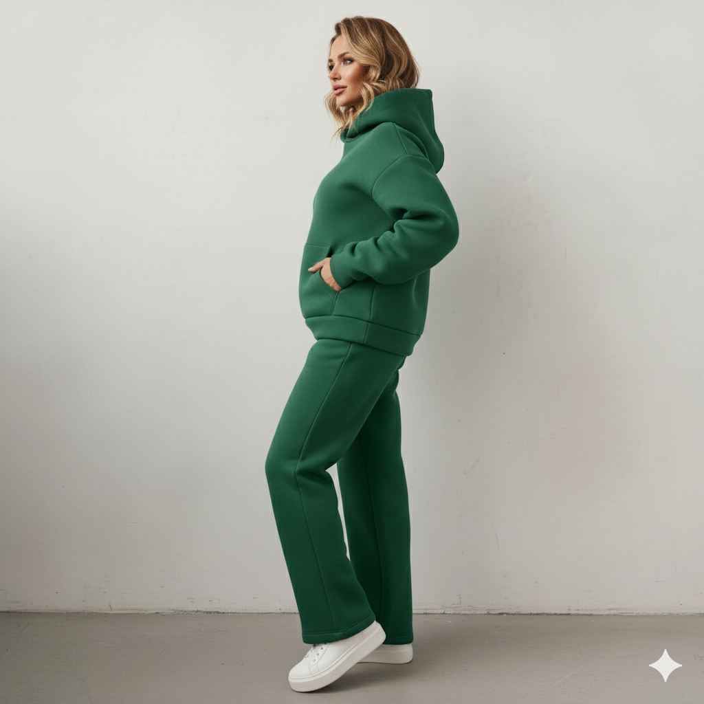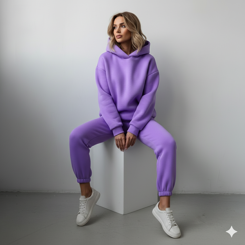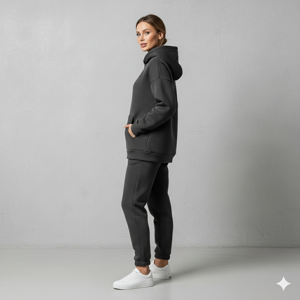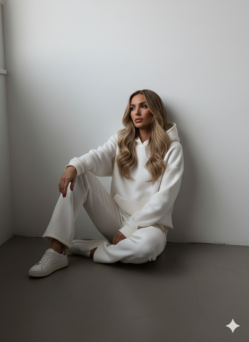 Erleben Sie das ultimative Gefühl von Wohlbefinden und lässigem Stil mit unserem warmen Damen Hoodie Zweiteiler. Dieses Ensemble ist Ihr neues Go-to-Outfit für die kühlen Tage und vereint einen kuscheligen Kapuzenpullover mit einer passenden Hose. Das hochwertige Material, wie z.B. weicher Cord, bietet nicht nur ein angenehmes Tragegefühl und Flexibilität, sondern hält Sie auch zuverlässig warm. Ideal für entspannte Tage zu Hause, den Wochenendausflug oder stylische Freizeitaktivitäten. Ein unschlagbares Set für alle, die Komfort lieben, aber nicht auf eine moderne Optik verzichten wollen!