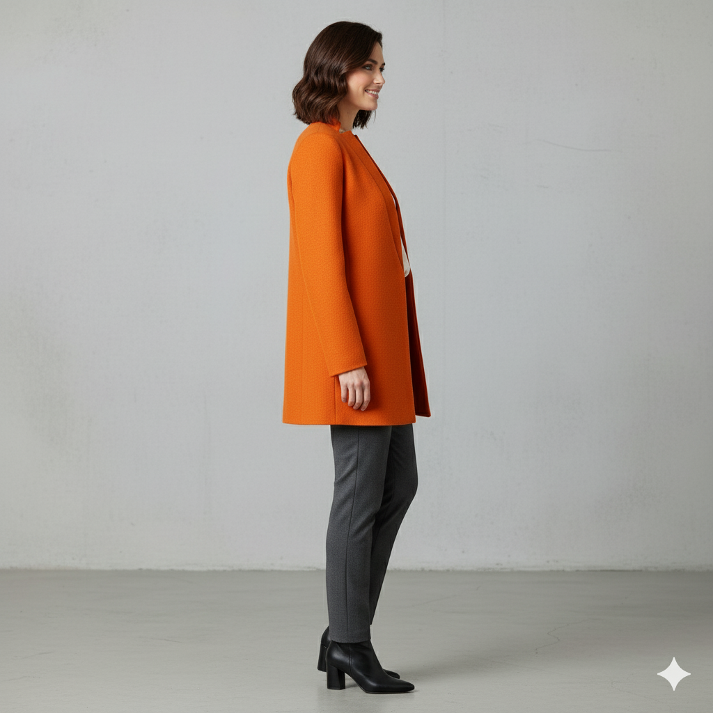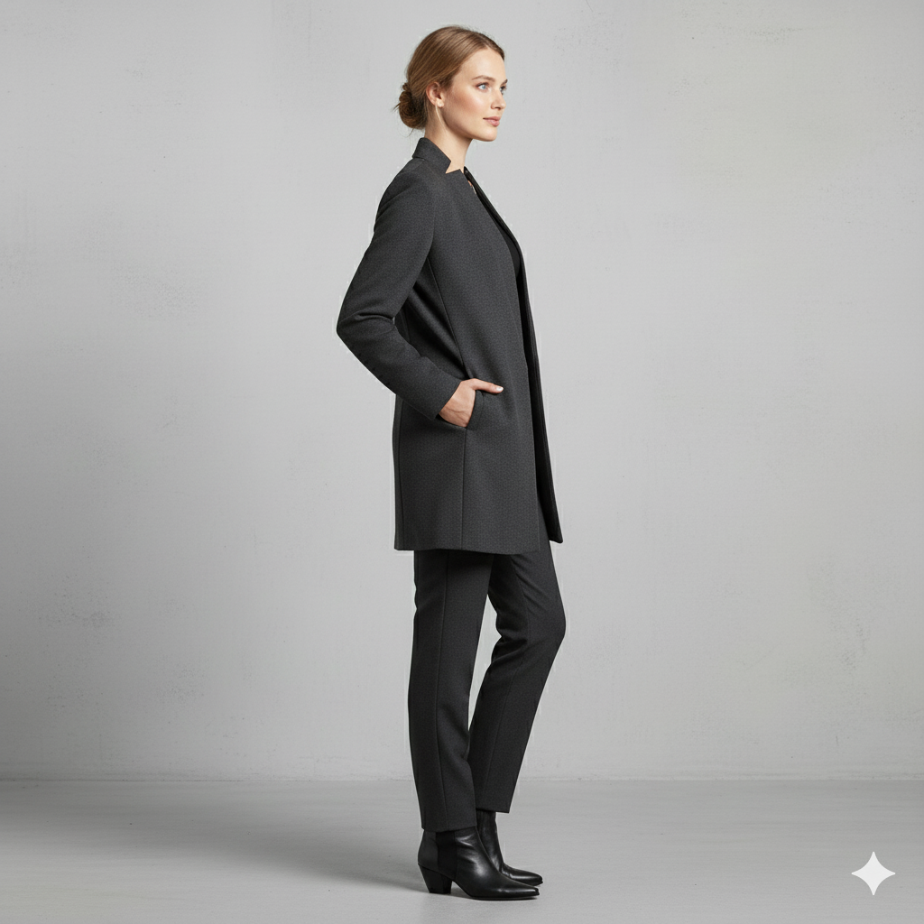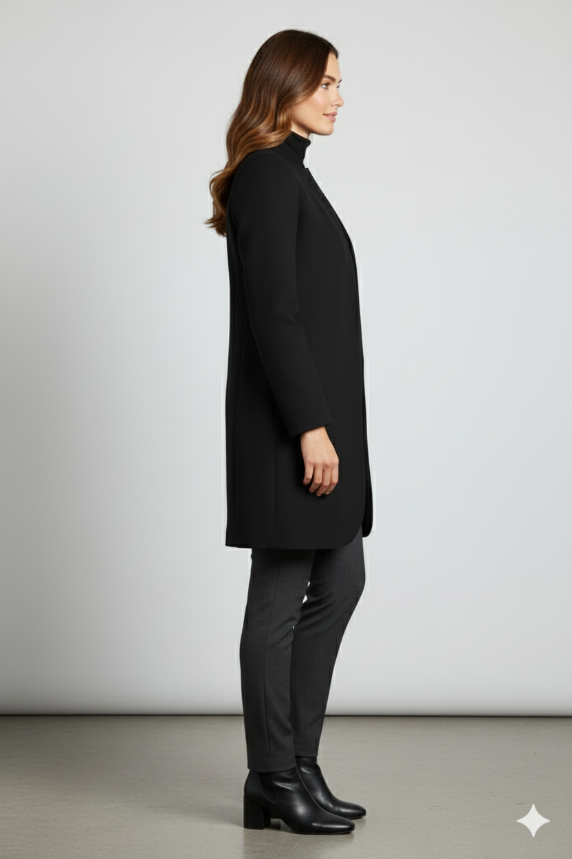 Der Damen Wollmantel mit Stehkragen überzeugt durch seine klare Linie und zeitlose Eleganz. Das hochwertige Wollmischgewebe sorgt für angenehme Wärme, während der gerade Schnitt und der dezente Kragen einen modernen, minimalistischen Look schaffen. Perfekt für Business und Alltag – jetzt entdecken und stilvoll durch die Saison gehen!