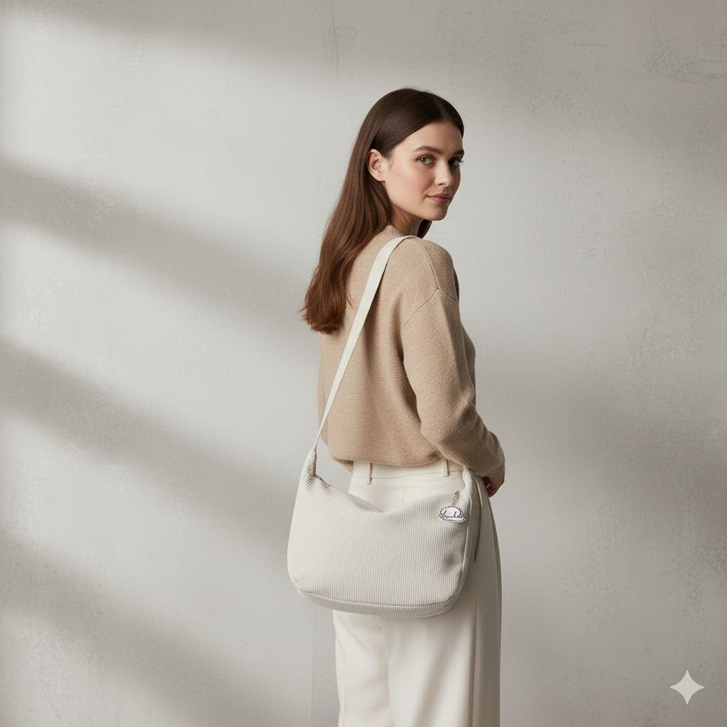 Die Lässige Damen Umhängetasche aus Cord im angesagten Hobo-Stil wird dein neues Everyday-Essential. Das weiche Cord-Material in hellem Beige verleiht ihr eine lässige Vintage-Ästhetik, während die entspannte Form genug Platz für deine wichtigsten Dinge bietet. Sie ist federleicht und unkompliziert – perfekt für den spontanen City-Trip oder den täglichen Gebrauch. Jetzt entdecken und verlieben!